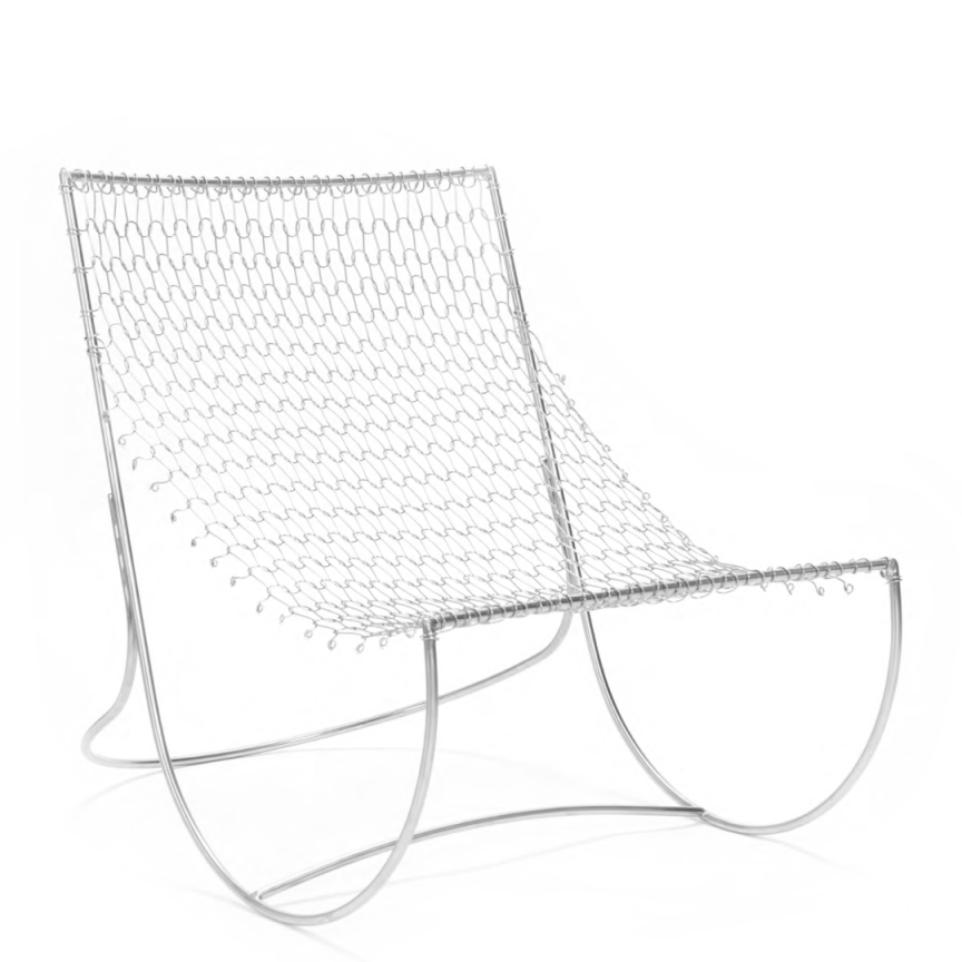 wirewirewire ist ein Sitzmöbelserie, bei der Edelstahldräh- te inspiriert durch das Stockinette-Stricken in der Textilindustrie verwendet werden. Im Gegensatz zu geschweißten Maschen werden die Elemente durch Einhaken miteinander verbunden. Die gestrickte Oberfläche verteilt den Druck gleichmäßig und bleibt dadurch flexibel. Die gestrickte Struktur wird ohne dauerhaf- te Befestigungen auf den Rahmen geklippt, so dass sie immer wieder ausgetauscht und repariert werden kann. Durch die Nutzung von Stahldraht und Verfahren des Textilhandwerks stellt dieser Entwurf herkömmliche Erwartungen an Metallstrukturen in Frage und eröffnet neue Möglichkeiten im Metallmöbeldesign.